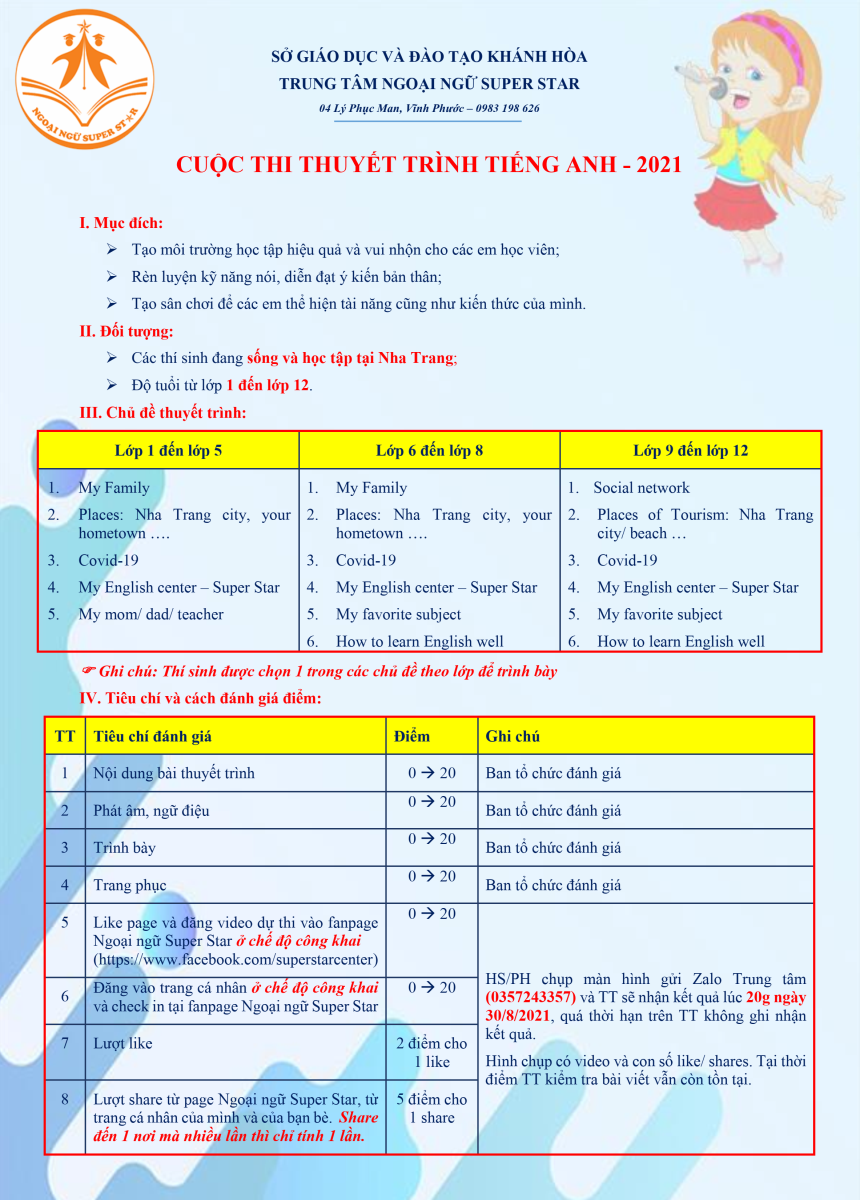 Chi tiết cuộc thi 'Thuyết trình tiếng Anh - 2021', mời quý phụ huynh, học sinh xem chi tiết. Để rõ hơn, xin liên hệ qua hotline 0983 198 626.