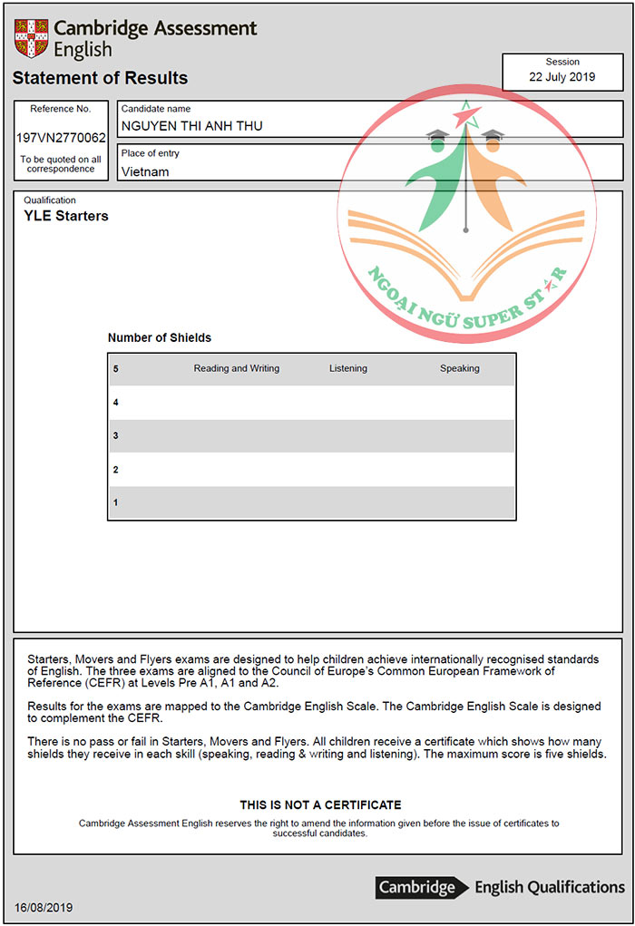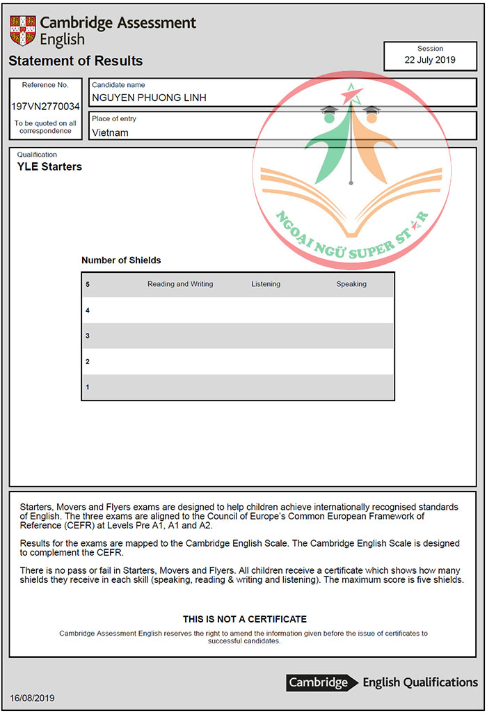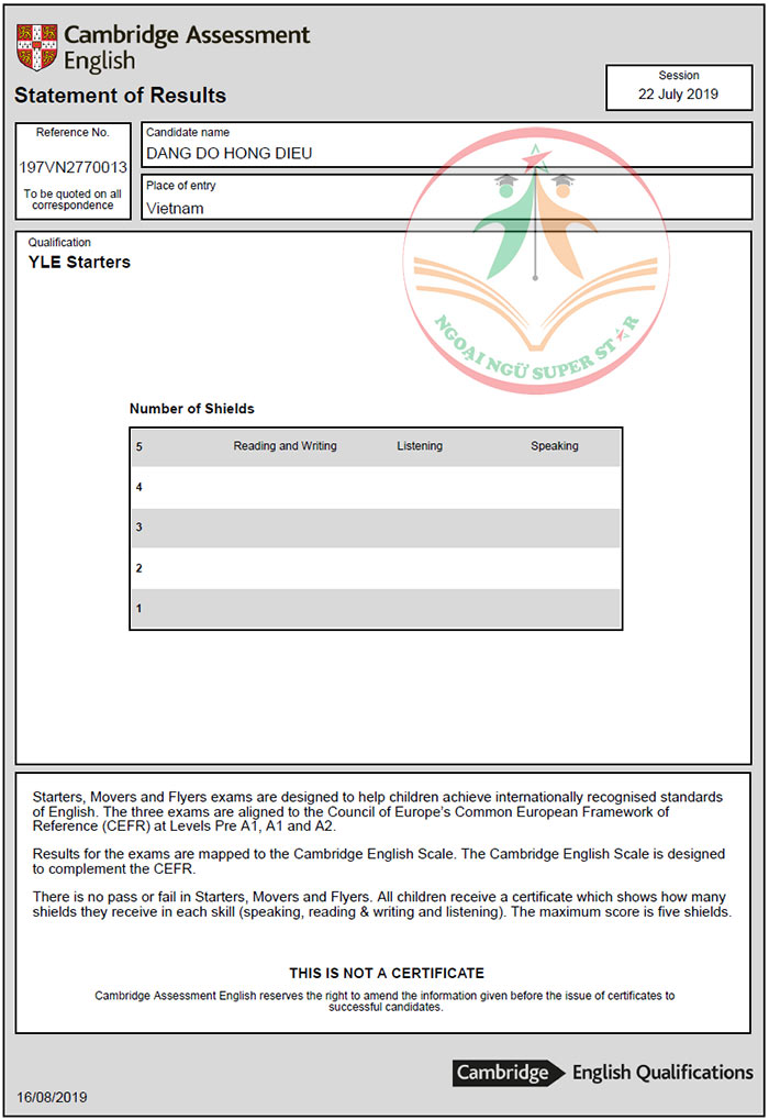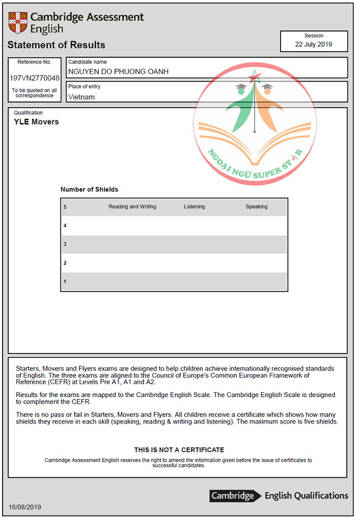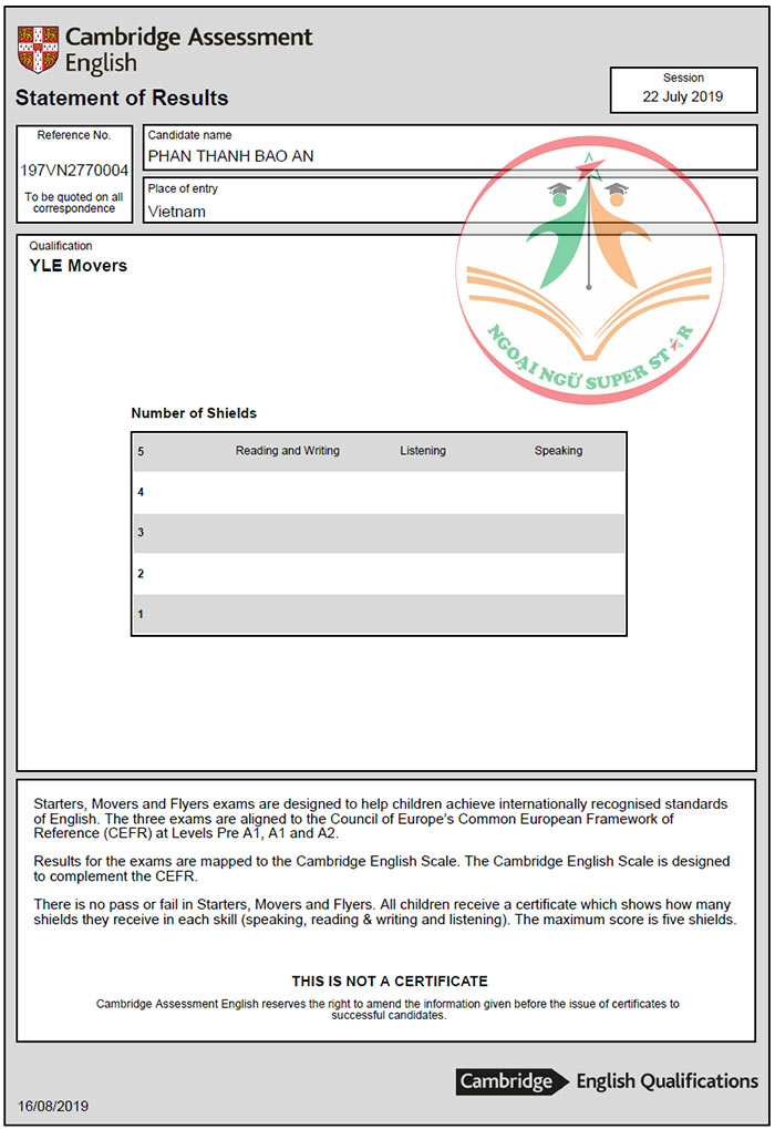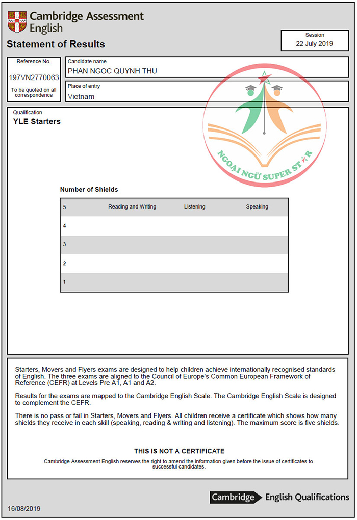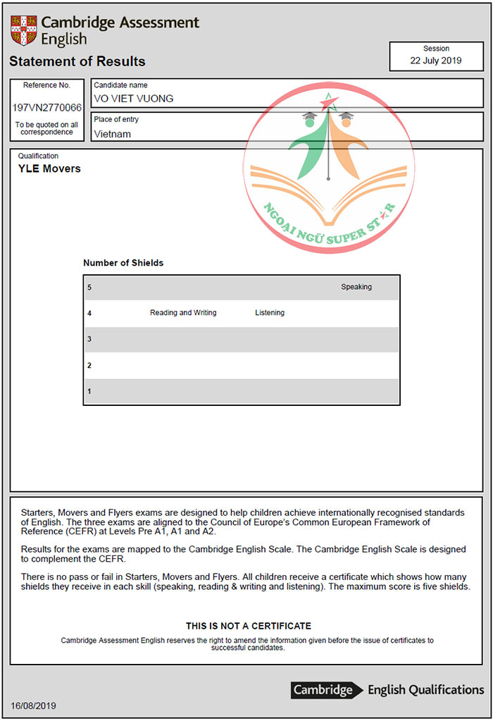 Trung tâm Ngoại ngữ Super Star thông báo đến Quý Phụ huynh và Học sinh đã có kết quả kỳ thi chứng chỉ Cambridge của Đại học Cambridge Anh (đợt thi 22/7/2019). Tất cả các học sinh tại Trung tâm đều đạt kết quả và trên 95% đạt kết quả tuyệt đối 4 kỹ năng (Nghe-Nói-Đọc-Viết).