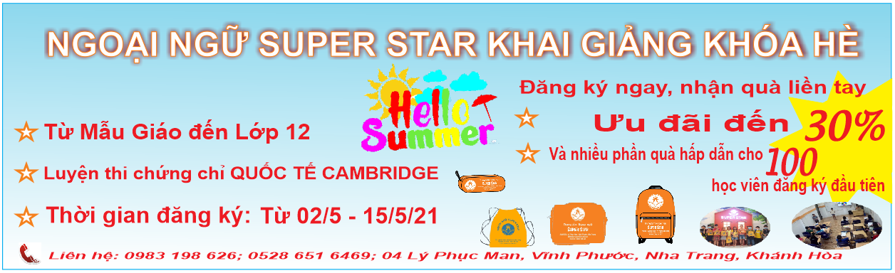 Nhằm đảm bảo sự phát triển liên tục của học viên, đặc biệt là tiếng Anh, Trung tâm Ngoại ngữ Super Star thông báo khai giảng khóa hè 2021 với nhiều thông tin và quà tặng hấp dẫn. Quý Phụ huynh; Học sinh nhanh tay đăng ký để có được phần quà như ý.