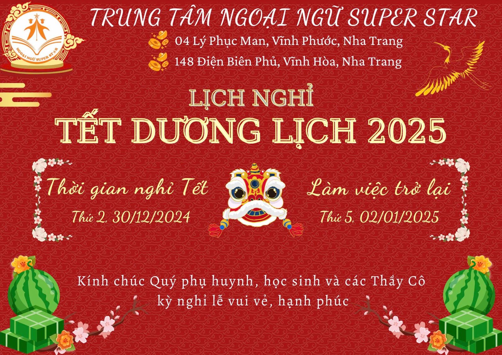 Kính chúc Quý Thầy cô, cán bộ Trung tâm Ngoại ngữ Super Star và toàn thể Phụ huynh, học sinh và khách hàng năm mới 2025 thành công