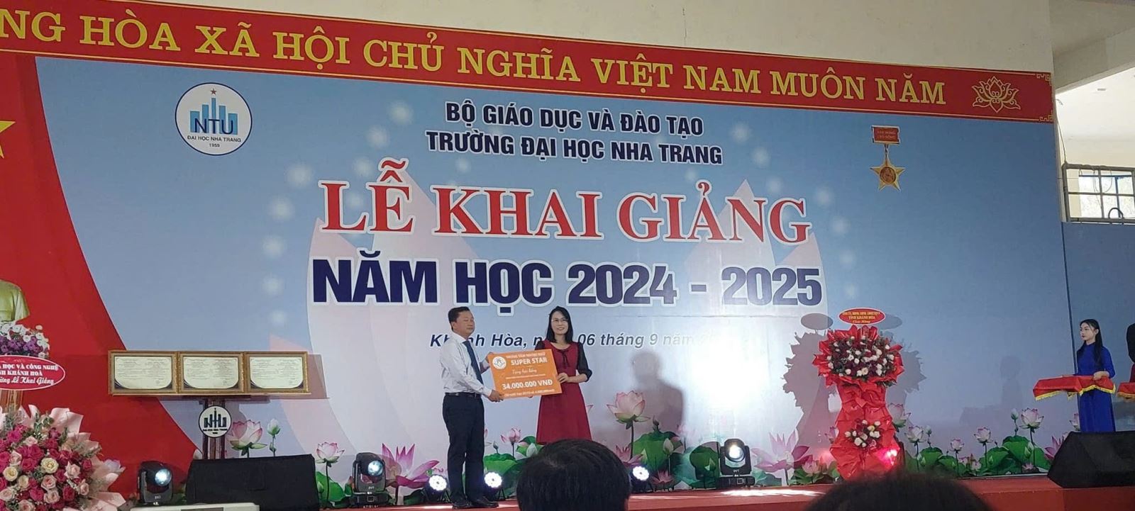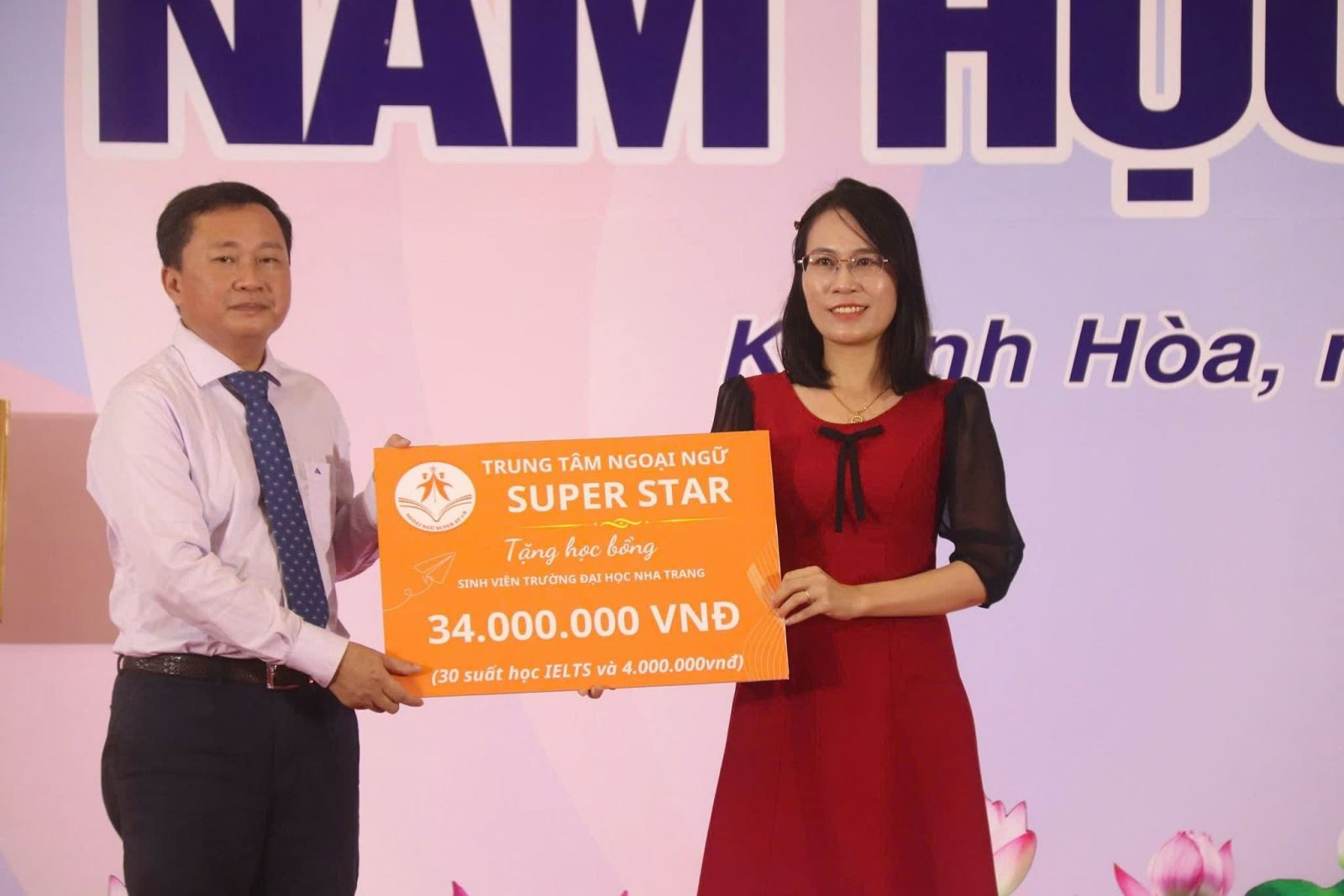 Đại diện Trường Đại học Nha Trang nhận biểu trưng học bổng (Bên trái là Thầy phó hiệu trưởng Quách Hoài Nam, bên phải là Giám đốc trung tâm Ngoại ngữ Super Star, cô Đặng Thị Phúc Trường)